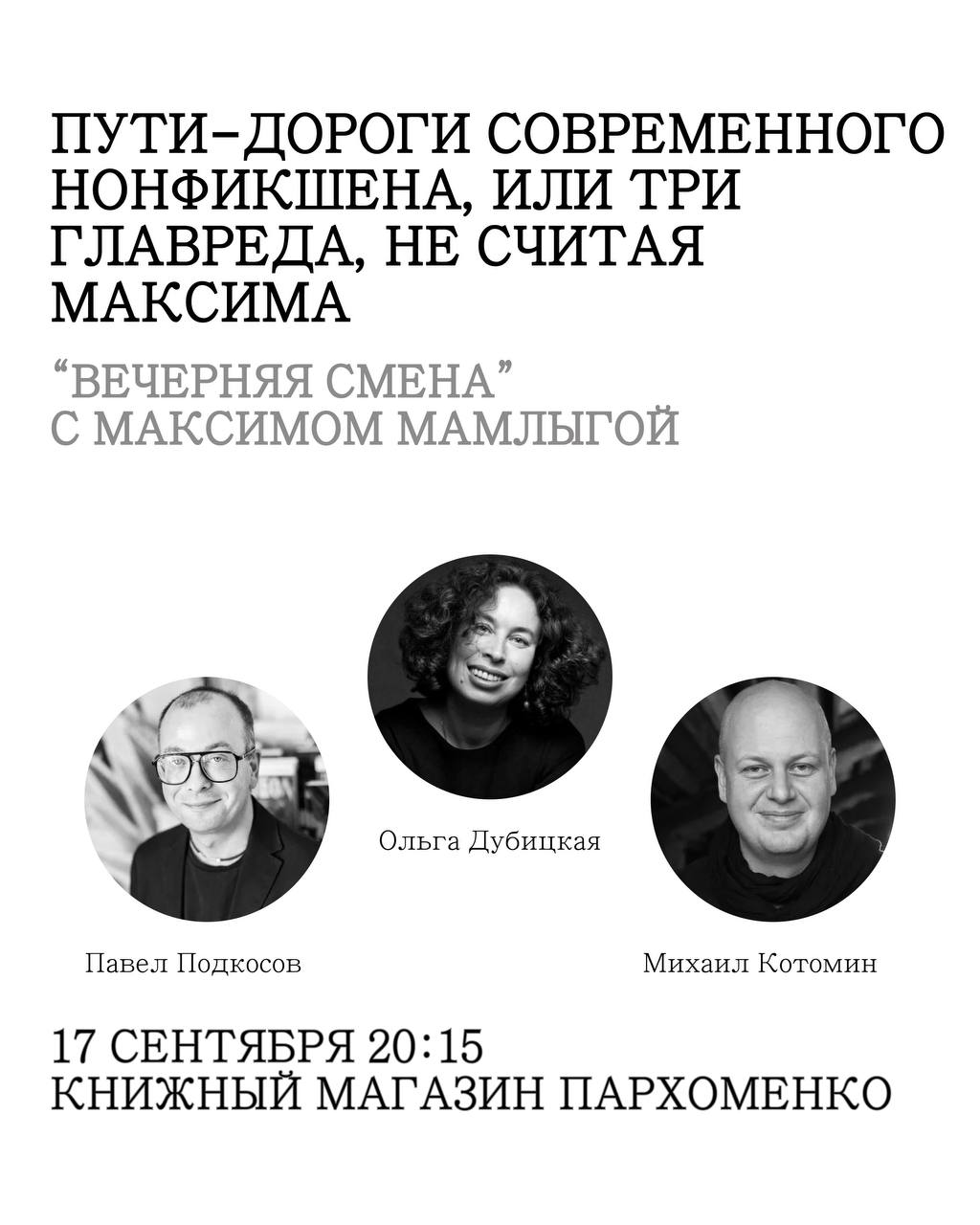 17 сентября в 20:15 во время «Вечерней смены» Максим Мамлыга поговорит с людьми, чьи книги заполняют большинство полок книжного магазин Пархоменко и все ваши полки, мы уверены💛